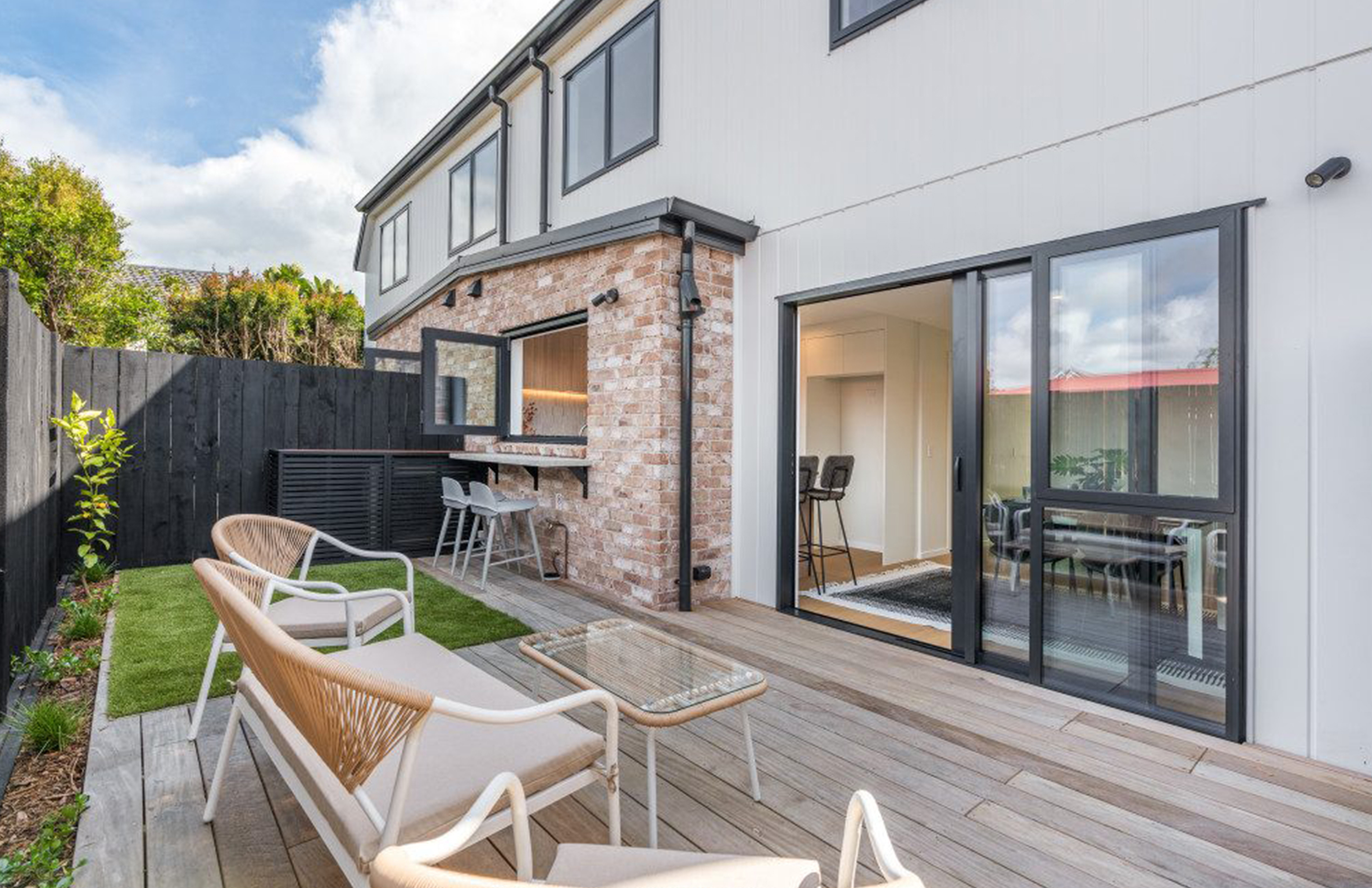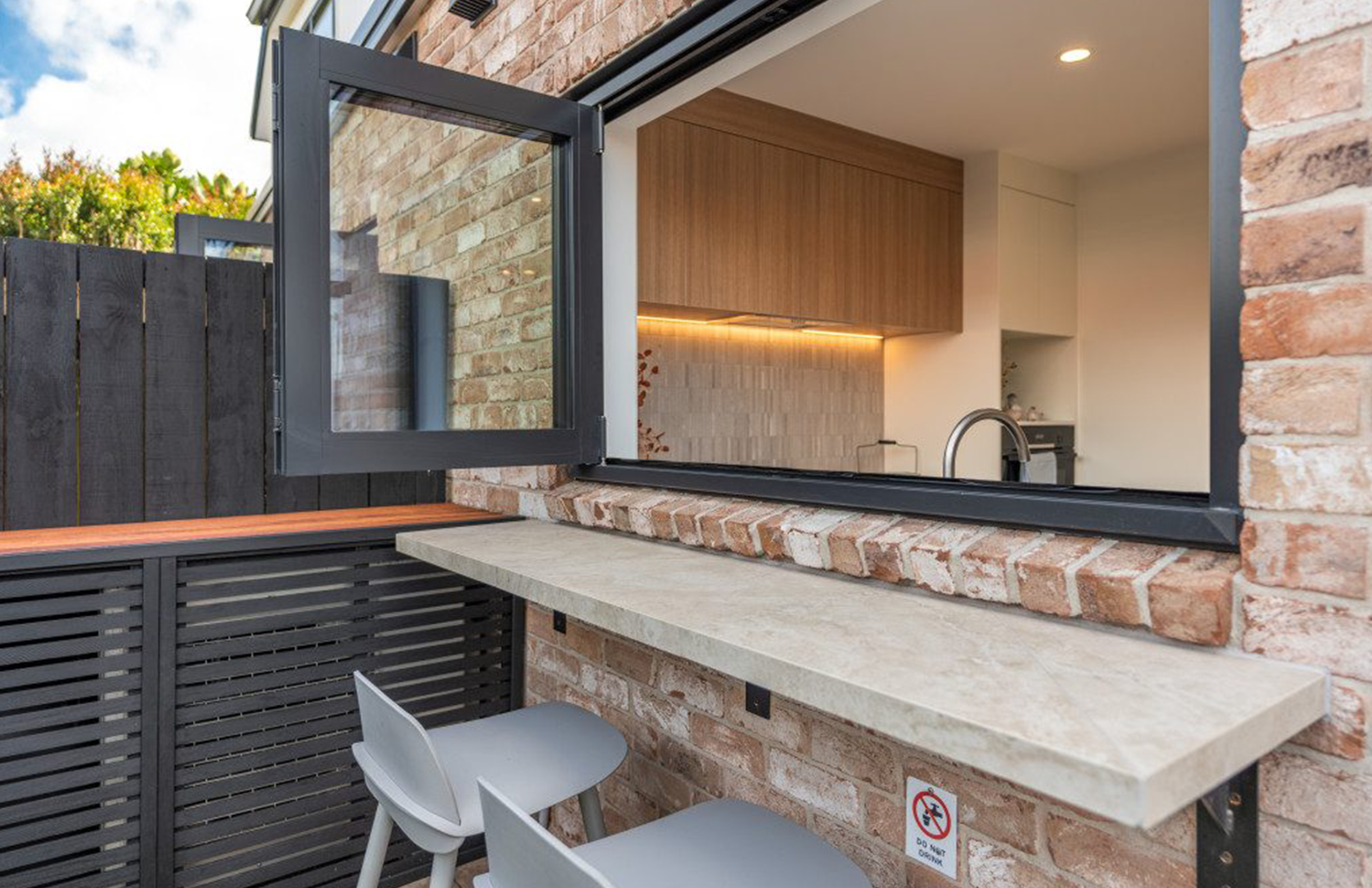 · Bi-fold kitchen windows opening to the patio — seamless indoor-outdoor flow